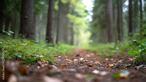 Serene forest pathway with lush greenery and soft natural light creating a tranquil atmosphere for relaxation : Generative AI