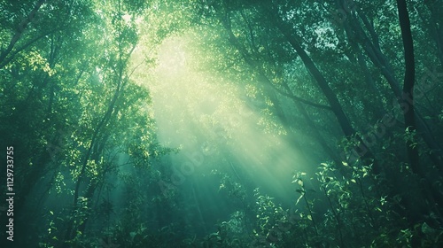 Serene Forest Scene with Sunlight Filtering Through Green Trees