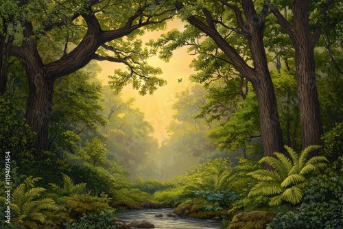 Serene Forest Scene with Sunlight Streaming Through Trees