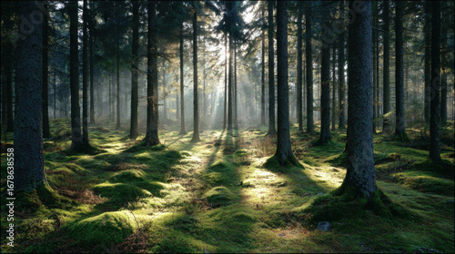 Serene forest scene with tall trees, sunlight filtering through branches, and lush green moss covered ground. atmosphere is tranquil and inviting, perfect for nature lovers