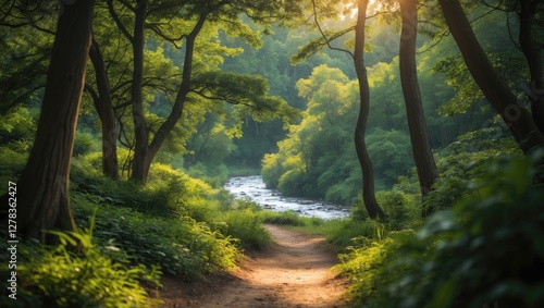 Serene Forest Trail with River Flowing Through Lush Greenery Under Soft Evening Light