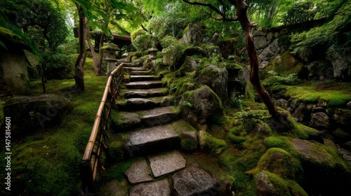 Serene Garden Pathway Surrounded by Lush Greenery and Tranquil Natural Elements in a Japanese Style Landscape