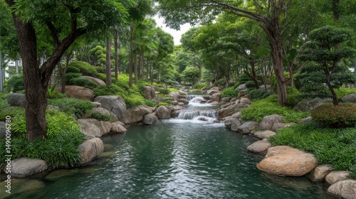 Serene Garden Stream with Cascading Waterfall and Lush Greenery