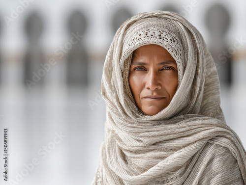 Serene Gaze of Tradition: A portrait captures a woman in traditional attire, her eyes reflecting wisdom and cultural depth, set against the backdrop of architectural beauty.