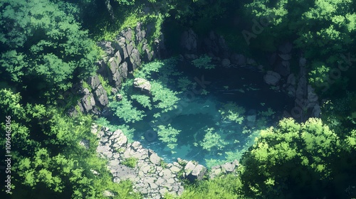 Serene green oasis with a tranquil pond surrounded by lush foliage.