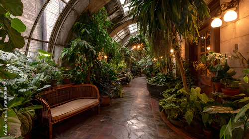 Serene Indoor Garden with Lush Greenery and Vintage Bench