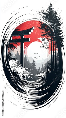 Serene Japanese Torii Gate and Ocean Waves A Zen-Inspired Artwork