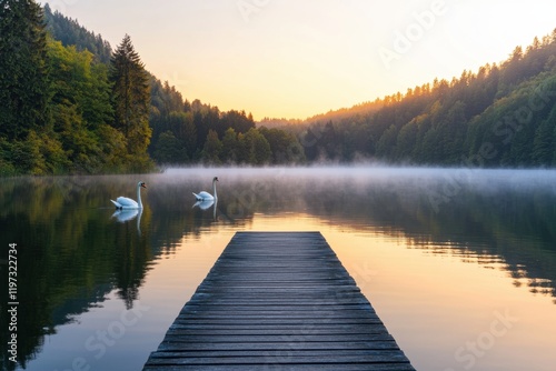 Serene Lake at Dawn with Swans and Mist-covered Forested Shores