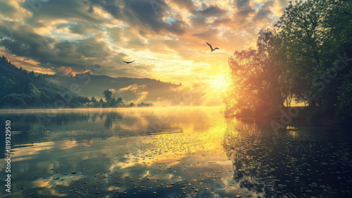 Serene lake at sunrise with birds, trees, and clouds reflecting on water