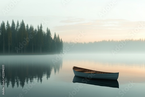 Serene Lake at Sunrise with Misty Fog and Rowboat