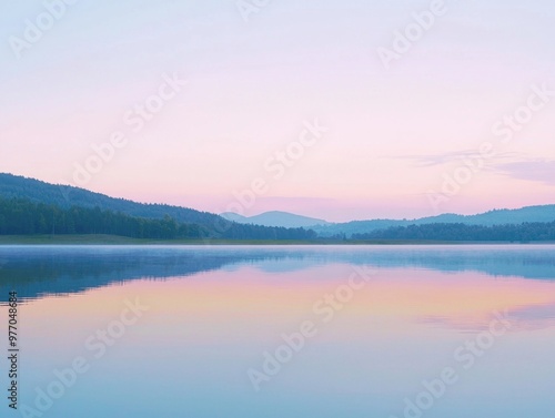 Serene Lake Landscape at Dusk with Tranquil Reflection of Mountains