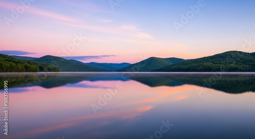 Serene lake reflecting the sky and forested hills at dawn, creating a peaceful and symmetrical landscape.