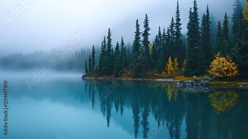 Serene lake reflection of evergreen forest in misty morning tranquil nature scene scenic view