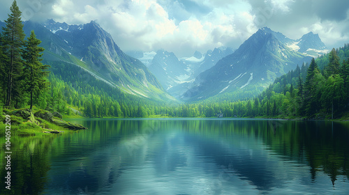 Serene lake reflects the majestic mountains and dense forests. The tranquil waters mirror the rugged peaks, while lush greenery lines its shore. A cloudy sky.