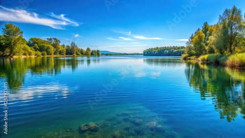 Serene lake with a gentle light stream of blue clear water flowing across the surface , peaceful, natural, peaceful