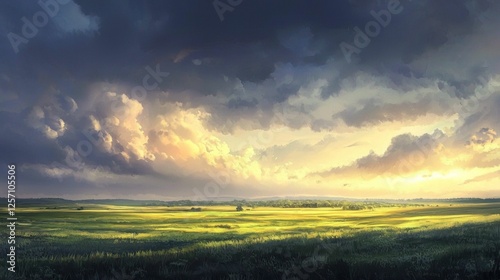 Serene Landscape at Dusk with Dramatic Cloud Formation and Golden Sunlight Casting Shadows on Lush Green Fields