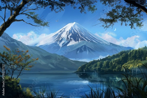 Serene landscape featuring mount fuji majestically reflected in a calm lake, surrounded by vibrant foliage, with a crescent moon adding a touch of magic to the tranquil scene