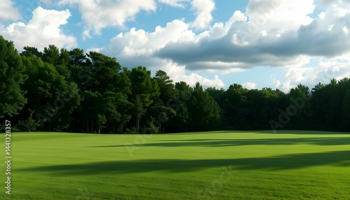 Serene Landscape: Lush Green Field Against a backdrop of Majestic Trees and a Cloudy Sky