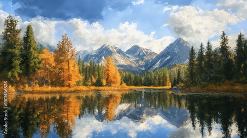Serene landscape painting of a mountain range with a lake in the foreground, trees reflecting on the water. Perfect for calming wall decor.