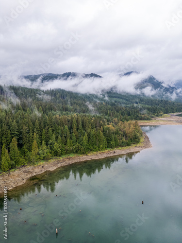 Serene Landscape View of Stave Lake and Forested Mountains in Mission, BC, Canada on a Cloudy Day