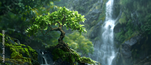 Serene Landscape with Lush Green Tree and Majestic Waterfall in a Tranquil Natural Setting