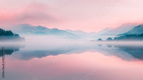 Serene landscape with misty mountains reflecting in calm waters during dawn.