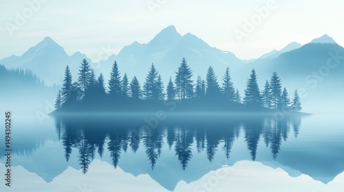 Serene Landscape with Mountains and Trees Reflected in Calm Water Under Soft Misty Light