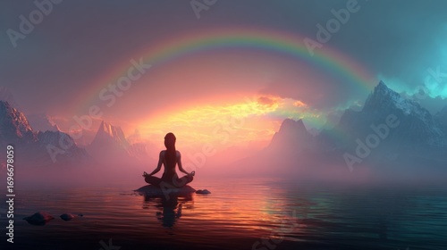 Serene Meditation Silhouette Under Rainbow: Finding Inner Peace in Nature's Embrace, Mindful Wellness