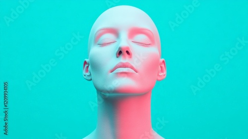 Serene Minimalism: A close-up shot of a woman's face, rendered in a smooth, almost sculptural style, against a vibrant teal backdrop. The lighting is dramatic.