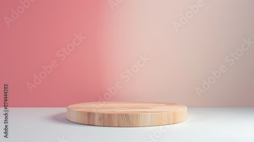 Serene Minimalist Mockup with Textured Wooden Podium and Soft Pastel Red Lighting on a Gradient Background