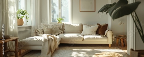 Serene Minimalist Scandinavian Living Room with Cozy Corner, Natural Light, and Soft Neutral Tones