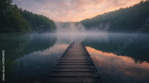 Serene misty lake at sunrise with wooden dock and forest reflections