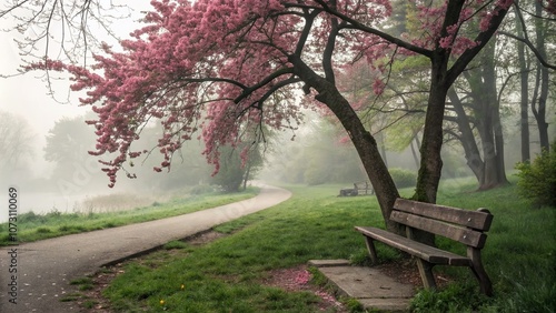 Serene Misty Morning in a Park with a Vibrant Pink Tree and a Cozy Bench, Capturing the Essence of Tranquility and Nature's Beauty at Dawn