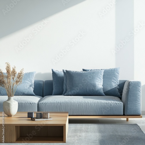 Serene Modern Living Room with Blue Sofa and Wooden Coffee Table