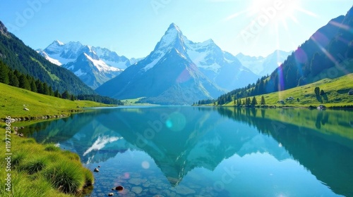 Serene Mountain Lake Reflection A Picturesque Vista of Majestic Peaks and Lush Green Meadows under a Sunny Sky
