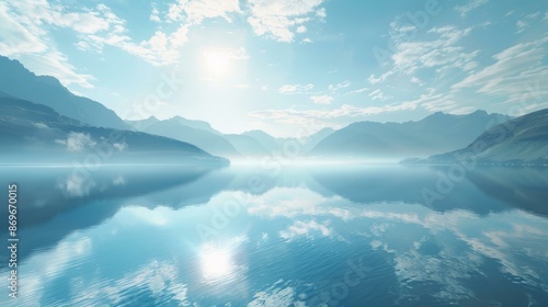 Serene mountain lake reflection. Calm blue lake reflecting sky and mountains on a sunny day, perfect for nature and travel themes.