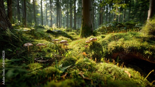 Serene mushrooms in a sunlit forest, symbolizing natural beauty and tranquility. Ideal for nature documentaries, ecological projects, and wellness content.