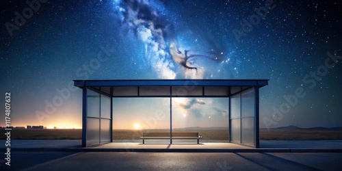 Serene Night Scene Empty Bus Shelter Under Starry Sky with a Bench