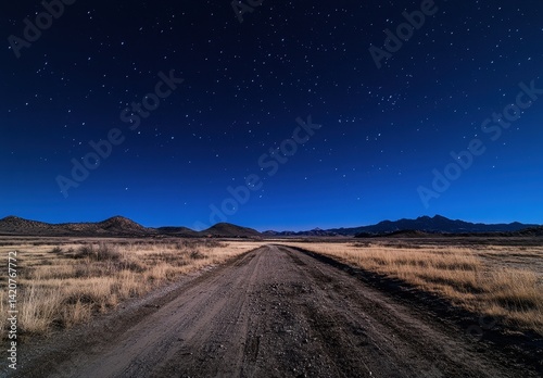 Serene Night Scene with Starry Sky Over Open Dirt Road in a Remote Landscape Surrounded by Rolling Hills and Grasslands Under Moonlight