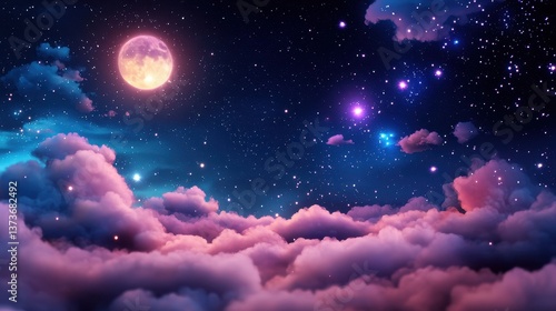 Serene Night Sky Scene with Radiant Full Moon Glowing Over Soft Clouds and Dazzling Stars for Tranquil Atmosphere