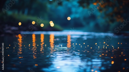 Serene Night Water Reflections Peaceful Orange Lights Dark Blue Water Abstract Background Dreamy Tranquil Nature Scene Evening Atmosphere Calm Relaxing Mood Soft Focus Bokeh Lights