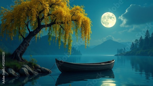 Serene nocturnal waterscape featuring a rowboat moored beneath a weeping tree, bathed in the ethereal glow of a full moon, reflecting tranquil beauty.