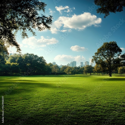 Serene park landscape with cityscape backdrop