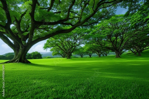 Serene Park Scene with Lush Green Grass and Majestic Trees