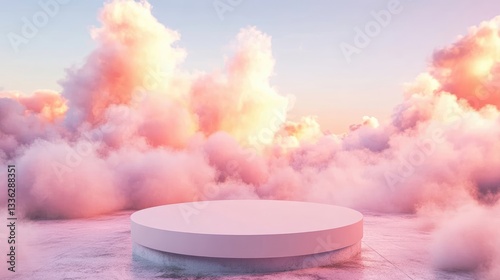 Serene pastel clouds envelop a circular platform at sunset, creating a tranquil and dreamy atmosphere for creative projects