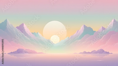 Serene pastel mountainscape at sunset, reflecting in calm water. Dreamy vector art background.