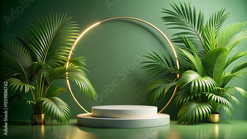 Serene Product Display in Nature with Soft Lighting and Neon Ring Backdrop