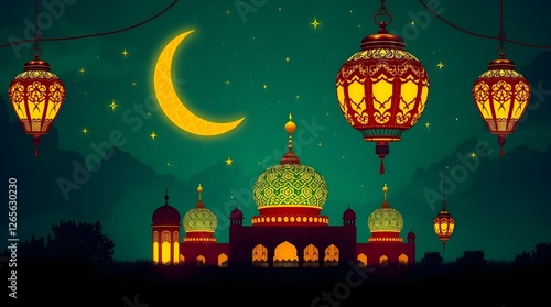 Serene Ramadan Night Illustration - Elegant and calm illustration featuring a mosque silhouette, crescent moon, and traditional lanterns in soft, warm colors