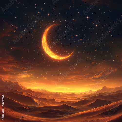 Serene Ramadan wallpaper featuring a peaceful desert landscape with a glowing crescent moon and scattered stars, accented by soft, warm tones and subtle Islamic designs