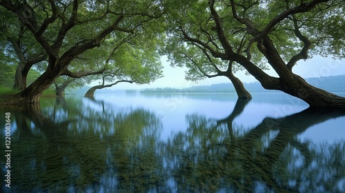 Serene Reflection of Trees Over a Calm Lake at Sunrise Mindfulness and meditation landscapes for digital or print backgrounds Stock photography